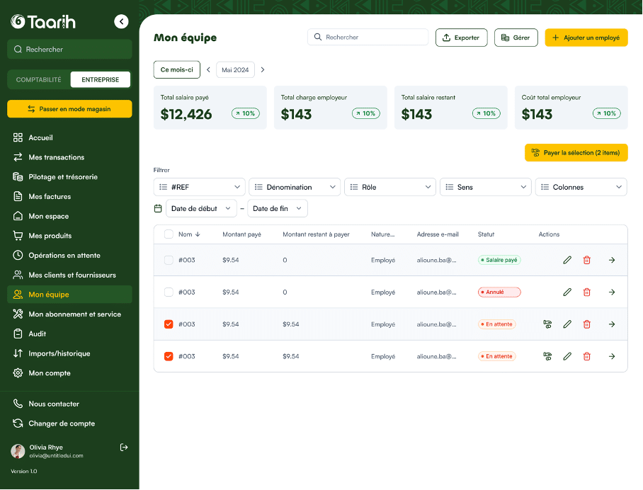 Optimisez l’administration de votre personnel avec Taarih. Gérez les fiches de paie, les contrats, les absences et les congés depuis une interface intuitive. Automatisez les calculs de paie et assurez-vous de respecter les obligations légales tout en offrant une expérience positive à vos employés.