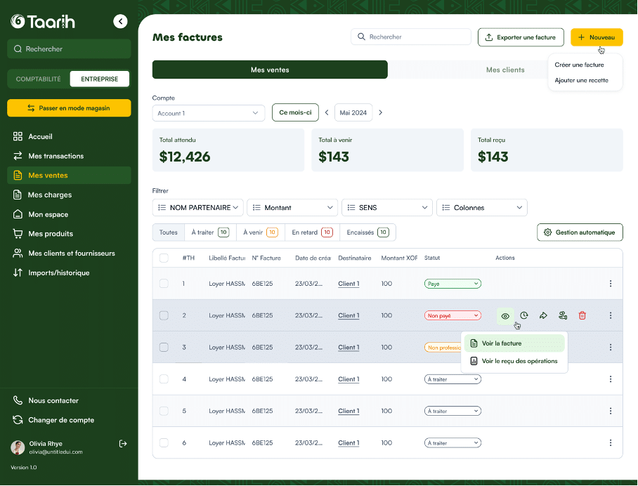 Notre solution de facturation permet de créer, envoyer et suivre vos factures en quelques clics. Gagnez du temps grâce à des modèles personnalisables et au suivi automatique des paiements. Taarih facilite également la gestion des relances et l’intégration de vos données comptables pour un flux de travail sans rupture. Évitez les retards de paiement et optimisez votre trésorerie avec des rapports clairs et précis.